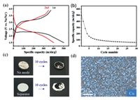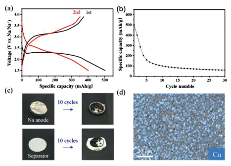 | Fig. 2. (a) Charge-discharge profiles of the CuF2-KB electrode at 0.05 C. (b) The cycling performance of the CuF2-KB electrode at 0.05 C. (c) Photos of the Na metal anode and separator before and after 10 cycles. (d) The EDS mapping image of the Na metal anode after 10 cycles. | |