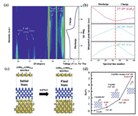 | Fig. 4. (a) In-situ XRD image of the CuF2-KB electrode in a cell with a C-coated separator corresponding to the first cycle. (b) The integrated peak intensity in the main peak area of CuF2 (011), Cu (111) and NaF (200) during the first cycle. (c) The initial state ((100)Cu/(100)NaF interface is short of a Na atom, forming a vacancy) and final state (the vacancy in the NaF interface is filled with a Cu atom) of a Cu atom inserting into the adjacent a sodium vacancy in the interface of Cu and NaF. (d) Energy states of Cu ions in the dissolution process. | |