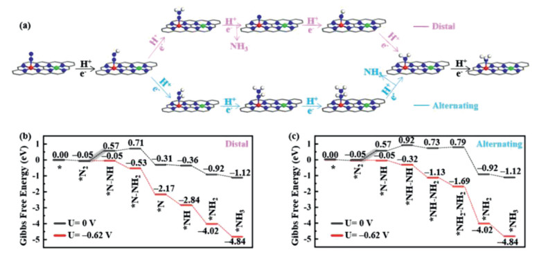 | Fig. 3. (a) Schematic representation of distal and alternating pathways for NRR in end-on configuration. Gibbs free energy diagrams of the NRR at zero potential (blake lines) and an applied potential (red lines) via the (b) distal and (c) alternating pathway on CrN4/MnN4-C. | |