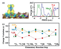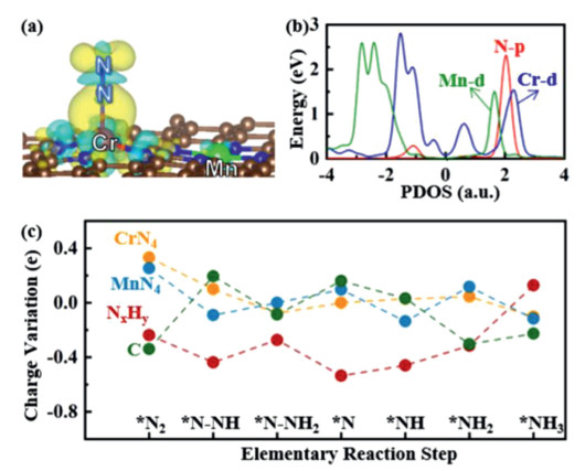 | Fig. 4. (a) Charge density difference maps of N2 adsorption on CrN4/MnN4-C, where the isosurface value is set to be 0.005 e/Å3. The positive and negative charges are shown in cyan and yellow, respectively. (b) Partial density of states (PDOS) of N2 adsorption on CrN4/MnN4-C. (c) The Bader charge variation of the CrN4/MnN4-C along distal pathway. | |