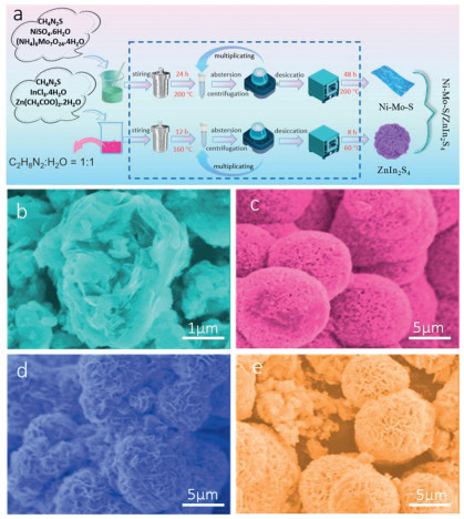 | Fig. 1. (a) Schematic illustration of the synthesis of Ni doped MoS2/ZnIn2S4 composite. SEM images of (b) ZnIn2S4, (c) MoS2, (d) Ni-Mo-S (Ni: Mo = 1:2), (e) Ni-Mo-S (Ni: Mo = 1:1). | |