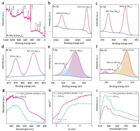 | Fig. 3. (a) Survey spectra of ZnIn2S4/Ni-Mo-S (Ni: Mo = 1:2) composites photocatalyst. High resolution XPS imagesof (b) Zn 2p, (c) In 3d, (d) Ni 2p, (e) S 2p, (f) Mo 3d. (g) UV–vis DRS spectra, (h) Tauc plots, (i) photoluminescence (PL) spectra of ZnIn2S4 and ZnIn2S4/Ni-Mo-S (Ni: Mo = 1:2). | |