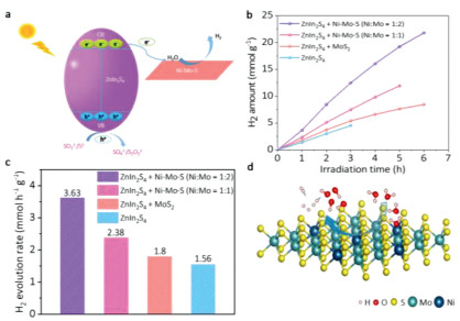 | Fig. 5. (a) Schematic of the charge carrier migration process of Ni-Mo-S/ZnIn2S4 composites in Na2S/Na2SO3aqueous solution (pH 13.2) under visible light irradiation. (b, c) Comparison of photocatalytic H2 evolution activities over ZnIn2S4, MoS2/ZnIn2S4, Ni-Mo-S/ZnIn2S4 (Ni: Mo = 1:2) and Ni-Mo-S/ZnIn2S4 (Ni: Mo = 1:1). (d) Atomic structure diagram of Ni-Mo-S nanosheets for H2O dissociation. | |