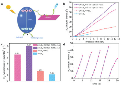 | Fig. 6. (a) Schematic of the charge carrier migration process of Ni-Mo-S/ZnIn2S4 composites in lactic acid aqueous solution (pH 2.5) under visible light irradiation. (b, c) Comparison of photocatalytic H2 evolution activities over ZnIn2S4, MoS2/ZnIn2S4, Ni-Mo-S/ZnIn2S4 (Ni: Mo = 1:2) and Ni-Mo-S/ZnIn2S4 (Ni: Mo = 1:1). (d) Cycling test of catalytic H2 generation from Lactic acid solution over the Ni-MoS/ZnIn2S4 (Ni: Mo = 1:2) nanocomposite. | |