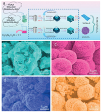 The schematic diagram of the preparation process of ZnIn2S4 and Ni-Mo-S is shown in Fig. 1a. The micromorphology of ZnIn2S4 and Ni-Mo-S samples with different Ni loads were observed by scanning electron microscopy (SEM). Fig. 1b shows the bract structure of pure ZnIn2S4 composed of many lamellar petals. Figs. 1c-e show SEM images of MoS2, Ni-Mo-S (Ni: Mo = 1:2) and Ni-Mo-S (Ni: Mo =1:1) respectively. It can be seen that their aggregates are similar in morphology. The diameter of microspheres is about 1.0 µm to 4.0 µm, and the edges are serrated, indicating that the microspheres are made up of a large number of interlaced flakes. This also shows that the doping of Ni2+ with different mole ratio hardly changes the morphology of MoS2. Due to the similar layered structure of ZnIn2S4 and Ni-Mo-S, the Ni-Mo-S nanosheets can be closely loaded on the ZnIn2S4 nanoflowers for self-assembly to form heterojunctions.
