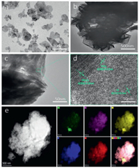 | Fig. 2. TEM images of (a) ZnIn2S4 and (b) Ni-Mo-S (Ni: Mo = 1:2). (c) TEM and (d) high resolution TEM images of Ni-Mo-S/ZnIn2S4 (Ni: Mo = 1:2) composites. (e) The corresponding EDX mapping images of Mo, Ni, S, In and Zn of Ni-Mo-S/ZnIn2S4 (Ni: Mo = 1:2) composites. | |