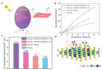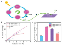 | Fig. 4. (a) Diagram of carrier migration process of Ni-Mo-S in EY/TEOA aqueous solution (pH 7) under visible light irradiation. (b, c) Comparison of photocatalytic H2 evolution activities over EY, MoS2/EY, Ni-Mo-S/EY (Ni: Mo = 1:2) and Ni-Mo-S/EY (Ni: Mo = 1:1) | |