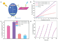 In the EY/TEOA system, we discussed the formation mechanism of hydrogen generation using EY as sensitizer, TEOA hole scavenger and Ni-Mo-S nanosheet as catalyst. Fig. 4a shows the schematic diagram of the electron transfer process of EY/Ni-Mo-S under visible light irradiation. The reaction is triggered by the light excitation of EY to produce the triple excited state (EY3*). Then, through reduction quenching, electrons are extracted from TEOA to produce free radical EY-. Electrons are easily transferred from highly reductive EY- to Ni-Mo-S nanosheets to reduce H+ generated by H2O decomposition to form an excited state H*. Two excited states H* react with each other to produce H2. In Fig. 4b, the hourly H2 dynamic productivity of different photocatalytic materials in the process of HER was tracked by a constant online detection system. It can be seen that the hydrogen evolution performance was significantly improved after the addition of cocatalyst in EY. With the increase of the ratio of Ni: Mo in Ni-Mo-S, the amount of hydrogen evolution increased. When the value of Ni: Mo is equal to 1:1, the catalytic performance is the best, and the maximum H2 production rate reaches 2.26 mmol h-1 g-1 (Fig. 4c). Therefore, Ni doped MoS2 nanosheets (Ni-Mo-S) can promote photocatalytic hydrogen evolution in EY/TEOA aqueous solution.