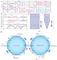 | Fig. 7. The band structure of (a) pure MoS2, (b) Ni replaces the edge Mo position of MoS2. (c) Ni replaces the middle Mo position of MoS2. (d) The partial and total density of states. (e, f) The charge density difference of MoS2 where the edge Mo is replaced by Ni. (g) Correlation of HER mechanism in lactic acid and Na2S/Na2SO3 system. Left: HER mechanism of Ni-Mo-S/ZnIn2S4 in lactic acid aqueous solution; Right: HER mechanism of Ni-Mo-S/ZnIn2S4 in Na2S/Na2SO3 aqueous solution. | |