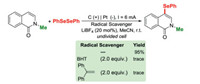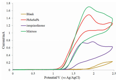To address the mechanistic aspects of the present electrochemical reaction, we conducted some mechanistic research. Firstly, the standard reaction was fully suppressed in the presence of radical scavengers (BHT and 1, 1-diphenylethylene) [49]. The results of radical capture experiment suggested that this reaction may proceed via a radical pathway (Scheme 4). Secondly, the electricity on/off experiments revealed that the present reaction did not proceed without constant current (Fig. 1), thus ruling out the free-radical chain mechanism. Eventually, the cyclic voltammetry experiment was conducted to gain information about the redox potential of the substrates. As shown in Fig. 2, the diphenyl diselenide 2a was oxidized at 1.10 V (vs. Ag/AgCl), which was lower than that of N-methyl isoquinolin-1(2H)-one 1a (1.29 V), and similar result was observed for the mixture of 1a and 2a, suggesting that 2a is oxidized preferentially at the surface of the anode in the developed reaction.