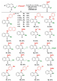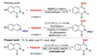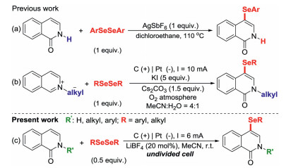 Isoquinolin-1(2H)–one skeleton is the core structure of many natural products and marketed pharmaceuticals [21-23]. Although selenium can bring positive effect to the physiochemical properties of bioactive molecules and drugs, the methods of introducing organic selenium groups into isoquinoline-1(2H)-ones are still limited, and the related research seriously lagging behind can no longer meet the social needs. So far, only two approaches available for constructing selenylated isoquinolin-1(2H)-ones have been reported. In 2018, Zhu and colleagues pioneered the synthesis of N-unsubstituted 4-selanylisoquinolin-1(2H)-ones through AgSbF6-mediated selanylation of isoquinolin-1(2H)-ones and organodiselenides (1 equiv.) via a radical pathway at high temperature [24]. Recently, Cao's group developed the electrochemical synthesis of N-alkyl 4-selanylisoquinolin-1(2H)-ones from N-alkylisoquinolinium salts and organodiselenides (1 equiv.) with KI as the electrolyte and Cs2CO3 as the base under oxygen atmosphere, in which the selenium cation was key intermediate [25]. These achievements may be significant, but they cannot offset the excessive demand for harmful chemical oxidants, additives and organodiselenide reagents, which not only increases the manufacturing cost, but also causes environmental problems. Furthermore, the above methods cannot be applied to the synthesis of both N-unsubstituted and N-substituted 4-selanylisoquinolin-1(2H)-ones at the same time. Therefore, an eco-friendly, economically and generally method for the synthesis of both N-substituted and N-unsubstituted 4-selanylisoquinolin-1(2H)-ones is still highly desirable.