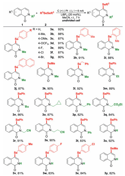 Initially, the electrochemical reaction of N-methyl isoquinolin-1(2H)-one (1a) and diphenyl diselenide (2a) was selected as the template reaction. By using a graphite rod as the anode, a platinum plate as the cathode, and LiBF4 (20 mol%) as the electrolyte, the desired product 3a was formed in 95% NMR yield under 6 mA constant current at ambient temperature in an undivided cell (Table 1, entry 1). Next, a number of electrode materials were screened to improve the reaction efficiency. However, inferior results were obtained when the graphite rod anode/platinum plate cathode system was replaced by other electrode systems (entries 2–7). The solvent effect was subsequently examined. Either trace amount or a much lower yield of 3a was detected in EtOH, DMSO, DCM, or THF (entries 8–11). As anticipated, the nature of electrolytes played a key role on this reaction. Both H4NI and KI only gave trace amount of 3a, whereas n-Bu4NBF4 and Et4NClO4 provided 3a with moderate yields (entries 12–15). Reducing the LiBF4 loading to 10 mol% marginally decreased the reaction efficiency (entry 16). Varying the loading of 2a and constant current did not deliver improved yield of 3a (entries 17–19). As a blank experiment, no product was afforded when this reaction was conducted in the absence of constant current (entry 20).