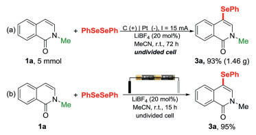 To prove the scalability of this protocol, the large-scale synthesis of selenylated isoquinolin-1(2H)-one was performed. Performing the electrochemical selenylation with 5 mmol 1a gave the desired product 3a in 93% isolated yield. In comparison to the small-scale reaction, the concentration of 1a could be increased 3.75-fold in gram-scale synthesis, thus minimizing the solvent consumption (Scheme 3a). It is well-known that battery is an abundant and readily available power supply. To our delight, the present electrochemical transformation could be easily achieved by employing 3-volt battery as the sole power supply (Scheme 3b). Taken together, the developed electrochemical protocol showed both practicability and simplicity.