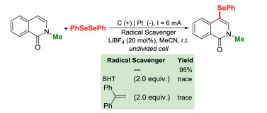 In summary, an environmentally friendly electrochemical initiated radical strategy was established for constructing both N-substituted and N-unsubstituted 4-selenylatedisoquinolin-1(2H)-ones (25 examples, 80%–93% yield). The present reaction, promoted by traceless and renewable electron, can be operated at ambient temperature under mild conditions, requiring neither chemical oxidants nor bass additives to proceed smoothly across a board range of selenylated quinolin-1(2H)–ones. Importantly, this reaction has achieved 100% atom economy with respect to expensive organodiselenides. The easily operated reaction conditions are neutral and mild, tolerating a variety of functional groups, and affording high yields with scalability. This methodology provides a new and effective way for the synthesis of 4-selenylatedisoquinolin-1(2H)-ones for pharmaceutical and fine chemical industry.