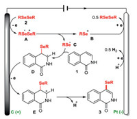 Taking into account the experimental information and the previously reported literature [24, 50-50], the possible mechanism for this electrochemical reaction is shown in Scheme 5. Firstly, the organodiselenide (2) underwent one-electron oxidation at the anode and was converted into the organodiselenide radical cation intermediate (A), which decomposed into an organ selenium cation (B) and an organ selenium radical (C). The intermediate B got one electron at the cathode and regenerated the compound 2 for the next cycle. Simultaneously, the radical C attacked C4 position of isoquinolin-1(2H)-one to produce radical D, which underwent one-electron oxidation to form isoquinolin-1(2H)-one cation (E). Ultimately, the intermediate E underwent dehydrogenation and re-aromatization to form the desired product 3. During the electrolysis process, the sole byproduct H2 was formed via one-electron reduction of the proton at the cathode.