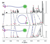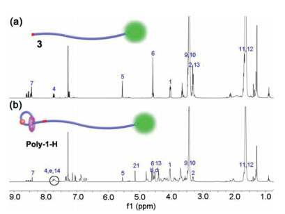 | Fig. 1. 1H NMR spectra (400 MHz, CDCl3, 298 K) of intermediate 3 (a) and polyrotaxane Poly-1-H (b). The black circle in the bottom indicates the presence of the triazole proton 14. | |