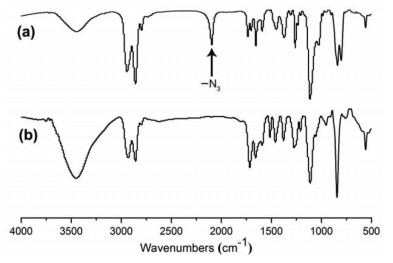 | Fig. 2. FT-IR spectra of intermediate 3 (a) and polyrotaxane Poly-1-H (b). | |
