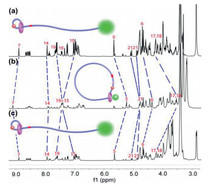The reversible topology transformation of polyrotaxane between linear structure Poly-1-H and cyclic state Poly-1 was particularly characterized by 1H NMR spectra and fluorescence spectra. In the initial state, the polymer rotaxane molecules Poly-1-H present linear structure and the DB24C8 macrocyclic components were located at the DBA recognition site (Fig. 3a). After addition of 5.0 equiv. of 1, 8-diazabicyclo[5.4.0]undec-7-ene (DBU) to the solution of Poly-1-H, the DBA site was deprotonation and the DB24C8 macrocycle shifted from DBA site to MTA site. There are several obvious characteristic signal peak changes (Fig. 3b). The signal peaks of proton of H5, H6 and H7 on or neighboring the MTA site were shifted with a Δδ of −0.42, −0.31 and 0.22 ppm, respectively, due to its interaction with the DB24C8 macrocycle. The signal peaks of methylene proton H17 and H18 on the DBA station were shifted with a Δδ of −0.69 ppm. The 1H NMR signal changes showed that the macrocycle moved to the MTA recognition site under the action of DBU and the polymer rotaxane molecular demonstrated cyclic structure. After the reprotonation of the -NH- group of the DBA site with 10.0 equiv. of CF3COOH (TFA), the 1H NMR signal peaks of Poly-1-H recovered to its original state (Fig. 3c).
