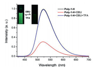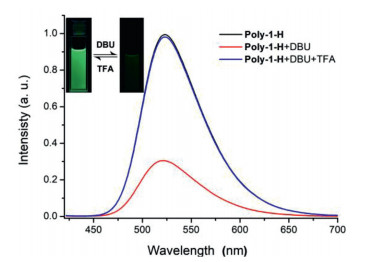 | Fig. 4. Normalized fluorescence spectral changes in the CH2Cl2 solution of Poly-1-H (1.0 × 10−5 mol/L). The mixture obtained after adding excess DBU to the solution of Poly-1-H and the mixture obtained after adding excess TFA to the DBU-added solution of Poly-1-H. The excitation wavelength was 410 nm. | |