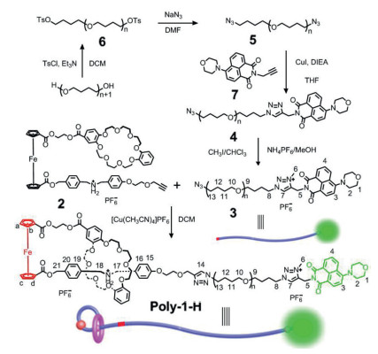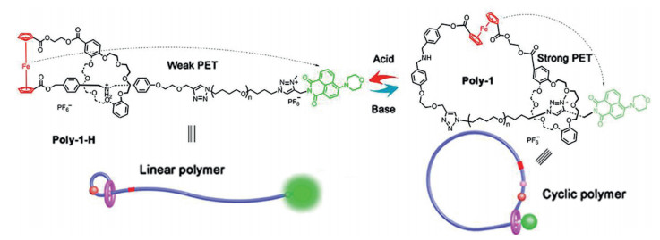 Here, we report a more convenient tactics for construction topology structure polymers between linear and cyclic transformation depending on simple acid-base stimuli, and this transformation process could be demonstrated by obvious visible fluorescence changes. As shown in Scheme 1, the target polyrotaxane Poly-1-H contains a ferrocene-functional [1]rotaxane at one end, and an electron-deficient 4-morpholinnaphthalimide (MA) at the other end. The electron-rich ferrocene unit and MA group are bridged by a chain polymer structure, and the two exist distance-induced photoelectron transfer (PET) process. There are two different recognition stations for the dibenzo-24-crown-8 (DB24C8) macrocycle at two ends of the polymer structure, that's dibenzylammonium (DBA) and N-methyltriazolium (MTA) site. The polyrotaxane Poly-1-H shows linear structure at the initial state and present relatively strong fluorescence, then the linear polymer transfer to cyclic structure Poly-1 under base environment, leading to the fluorescence intensity decrease due to the PET process between ferrocene unit and MA group. And then the cyclic structure returns to its linear state under acid stimuli, accompanying the fluorescence intensity recovering to its initial state. What is more, the structure transformation process is accompanied by visual fluorescence changes. We expected this work will put forward a small step towards to preparation topological structure polymers.