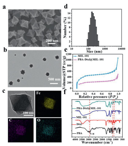 | Fig. 1. The characterization of PBA-Dtxl@MIL-101@BSA nanoparticles. SEM (a) and TEM (b) images of MIL-101 nanoparticles. (c) HRTEM-mapping images of MIL-101 nanoparticles and the elemental mapping of Fe, C, O. (d) The average hydrodynamic diameter of MIL-101 nanoparticles. (e) N2 isothermal adsorption–desorption curves of PBA-Dtxl@MIL-101 nanoparticles and MIL-101 nanoparticles. (f) FT-IR spectrum of PBA, Dtxl, MIL-101, PBA-Dtxl@MIL-101 nanoparticles. | |