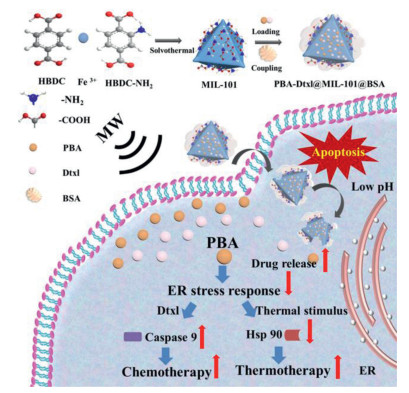 Inspired by the aforementioned aims, we have designed a pH and MW dual stimuli-responsive nanoplatform that further acted as an ER inhibitor for enhancing chemotherapy and thermotherapy. Docetaxel (Dtxl) is chosen as a traditional antineoplastic drug. 4-Phenylbutyric acid (PBA) as chemical chaperone is used to alleviate ER proteotoxicity and avoids unfolded protein response. Amino functionalized Fe-metal organic framework (MIL-101) nanoparticles were synthesized to obtain PBA-Dtxl@MIL-101 nanoparticles with both pH and MW stimuli-response. PBA-Dtxl@MIL-101 nanoparticles showed obvious inhibition of ER stress by downregulating HSP 90 and further enhanced sensation to tumor cells by upregulating caspase 9 (Scheme 1). In contrast to conventional thermotherapy and chemotherapy, this smart drug delivery system as ER stress inhibitor significantly obstructs tumor cells survival for maximizing treatment efficacy and minimizing treatment resistance.
