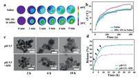 During the MW heat response experiment, when dispersing MIL-101 nanoparticles in saline, MIL-101 nanoparticles with high specific surface area result in the rise of temperature due to ion collision. In order to reach the ideal temperature, 5 mg/mL of MIL-101 nanoparticles dispersed in saline and the saline as control group were treated with MW stimulus at 0.6 W for 5 min. As shown in Fig. 2b, the temperature change of saline, MIL-101 nanoparticles were 13.7 ℃, 17.3 ℃, indicating MIL-101 nanoparticles realized MW heating response. The temperature change process was recorded by forward-looking infrared (FLIR) imaging, Fig. 2a showed the temperature change process of saline, MIL-101 nanoparticles with MW stimulus. The result confirmed that MIL-101 nanoparticles possessed MW response. Thus MIL-101 nanoparticles were employed for fever-type heating [21].
