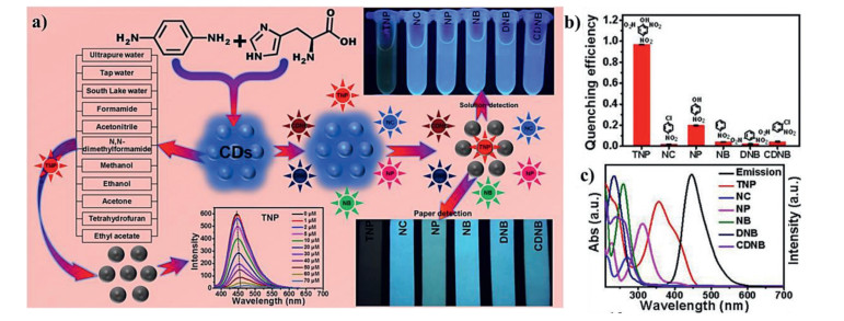 | Fig. 10. (a) Schematic diagram for synthesizing amphiphilic fluorescent CDs and their application in TNP detection. (b) Fluorescence quenching efficiency of CDs upon the addition different nitroaromatics. (c) Absorption spectra of various nitroaromatic compounds and the emission spectrum of CDs. Copied with permission [135]. Copyright 2019, Elsevier. | |