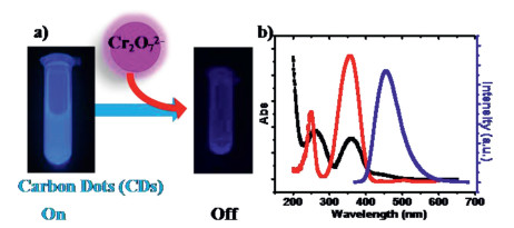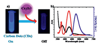 | Fig. 11. (a) Schematic illustration of fluorescence assays of CDs for the detection of Cr2O72− based on IFE. (b) Fluorescence excitation (red solid line) and emission (blue solid line) spectra of CDs and UV-vis absorption spectrum of Cr2O72− (black solid line). Copied with permission [138]. Copyright 2013, American Chemical Society. | |