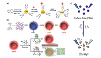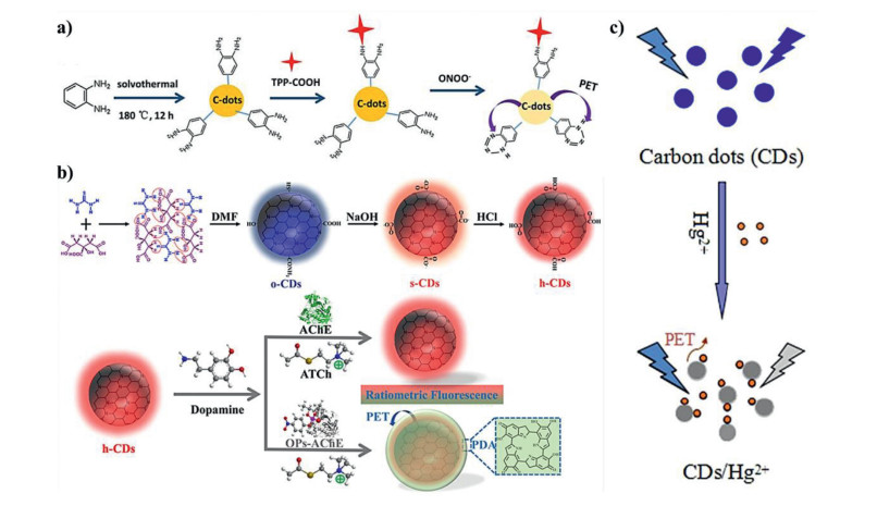 | Fig. 12. (a) Schematic illustration of preparation of CDs and a suggested PET mechanism of fluorescence quenching of C-dots-TPP in the presence of ONOO–. Copied with permission [140]. Copyright 2017, Elsevier. (b) Synthesis route of CDs and schematic illustration of h-CDs/DA-based sensor for OPs detection. Copied with permission [141]. Copyright 2020, American Chemical Society. (c) Schematic of CDs as sensors for the sensing process of Hg2+ ions. Copied with permission [142]. Copyright 2016, Elsevier. | |