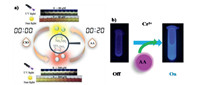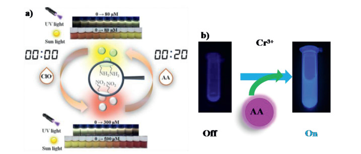 | Fig. 13. (a) Reversible sensing performance of RD-CDs for ClO– and AA in colorimetric and fluorescence modes. Copied with permission [121]. Copyright 2019, American Chemical Society. (b) Schematic illustration of fluorescence assays for AA based on reduction reaction of CD-Cr(VI). Copied with permission [138]. Copyright 2013, American Chemical Society. | |