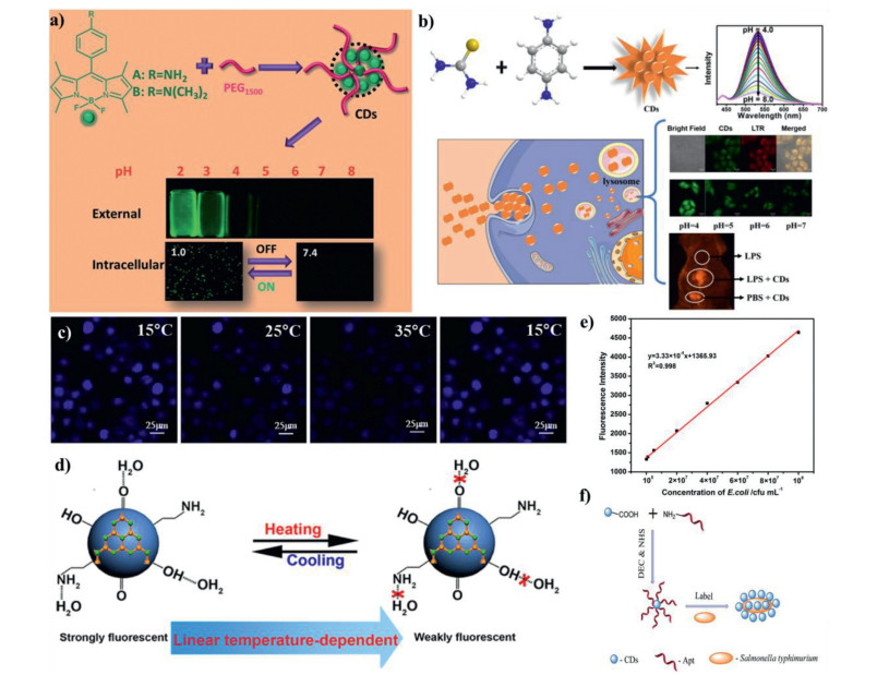 | Fig. 14. (a) Synthetic scheme for CDs and their application as pH probes. Copied with permission [14]. Copyright 2018, Royal Society of Chemistry. (b) Schematic illustrating the fabrication of CDs, their lysosome targeting ability and applications for probing pH changes in vitro and in vivo. Copied with permission [149]. Copyright 2020, Elsevier. (c) Confocal microscopy images of N, S, I-CDs-colon cancer cell HT-29 with corresponding fluorescence field at 15, 25, 35 and 15 ℃, respectively. Copied with permission [17]. Copyright 2020, Elsevier. (d) Schematic mechanism for the temperature-dependent fluorescence intensity of N-CDs. Copied with permission [16]. Copyright 2015, American Chemical Society. (e) The linear calibration of fluorescence intensities for the W-CDs at 1.17 mg/mL in the presence of various amount of E. coli O157:H7 within a concentration range of 105–108 cfu/mL. Copied with permission [19]. Copyright 2016, Elsevier. | |