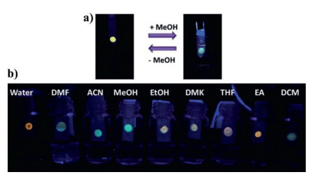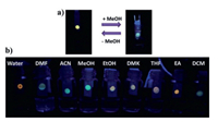 | Fig. 15. (a) The reversible emission color changes of CDs indicator paper under UV lamp (365 nm). (b) Photographs of the paper sensor printed with CDs after exposed to the VOCs under the UV lamp (365 nm). Copied with permission [115]. Copyright 2016, Royal Society of Chemistry. | |
