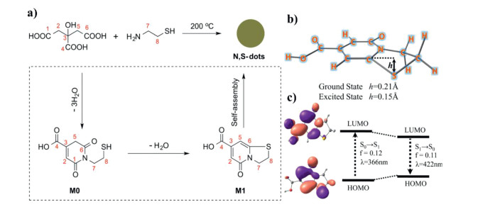 | Fig. 4. (a) Preparation of CDs and luminescent mechanism diagram. (b) The theoretically simulated optimal configuration of M1 and (c) the HOMO and LUMO energy level arrangement about its ground and excited states. Copied with permission [108]. Copyright 2016, American Chemical Society. | |