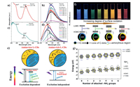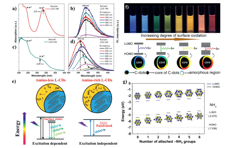 Surface state is widely used to explain the mechanism of CDs PL. The abundant surface states of CDs are excited to undergo radiation recombination, which makes CDs emit different fluorescence [109]. Therefore, the functional groups or emissive centers on CDs have a great influence on their PL. The surface state of CDs could be modified chemically, which can change or generate new energy levels and further modulate PL property [110]. Li et al. utilized hydrothermal methods to change the passivated degree of CDs surface and study the luminescence mechanism of CDs [111]. They certificated that the contents of amino groups on the surface of CDs are the factors that affect the luminescence of CDs (Figs. 5a–e). CDs were successfully synthesized from thiourea and p-phenylenediamine [110], and purified by column chromatography to obtain multicolor CDs from blue to red. Since the CDs have similar size distribution and graphite structures, size effect was excluded. Through structural analysis of these samples, the researchers found that different extent of surface oxidation caused the band gap of CDs gradually decrease, leading to the fluorescence shift from blue to red (Fig. 5f). After that, they also studied the discrepancy of CDs with different surface states, with the aid of single-particle fluorescence imaging technology. The result revealed the rationality about the surface states mechanism of CDs [112]. At the same time, model CDs with different contents of amino groups were constructed via the density functional theory (Fig. 5g). It was found that the more amino groups on the surface of CDs, the smaller the energy level, which caused the red shift of emission. The above results demonstrate that luminescence is related to the surface states of CDs.