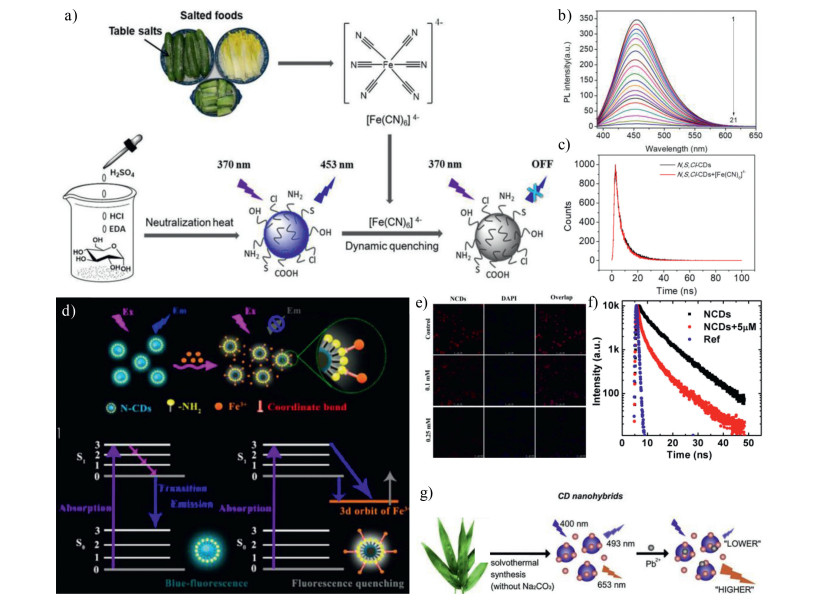 Hu et al. prepared N, S, Cl-CDs from salty food via acid hydrolysis, (Fe(CN)6)4- can effectively quench the fluorescence of N, S, Cl-CDs by dynamic quenching (Figs. 8a–c) [128]. Thus, N, S, Cl-CDs can be successfully used to detect (Fe(CN)6)4- in food samples with high sensitivity. Liu et al. prepared N-CDs by oxidizing cork materials. Fe3+ can effectively quench the fluorescence of N-CDs [129]. They suggested that the excited electrons of CDs were transferred to the 3d orbit of Fe3+ (Fig. 8d), and these non-radiative electron holes cause fluorescence quenching. At the same time, after adding Fe3+, the fluorescence lifetime of CDs was attenuated, which further proved the dynamic quenching mechanism. Song et al. also demonstrated the multicolor N-CDs have similar quenching mechanism for detecting Fe3+ in living cells (Figs. 8e and f) [130]. Pb2+ ions could effectively quench the fluorescence of CDs synthesized from bamboo [131], with LOD less than 0.14 nmol/L (Fig. 8g).