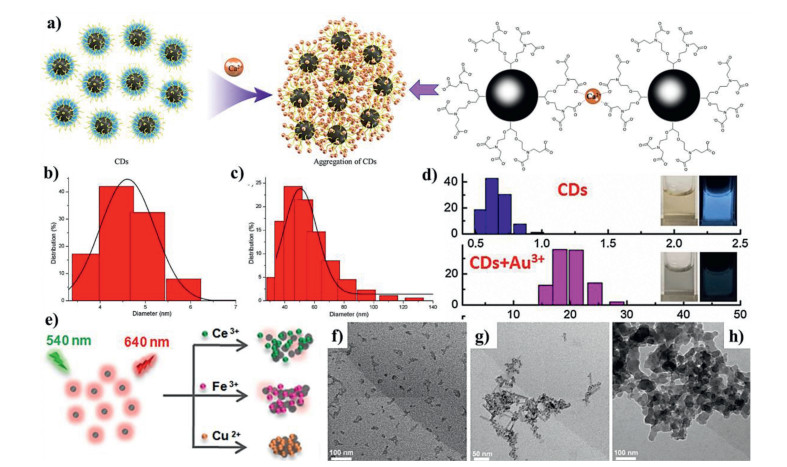| Fig. 9. (a) Schematic diagram of Ca2+ ions induce CDs aggregation. The hydrodynamic diameters of CDs before (b) and after (c) the addition of Ca2+ ions. Copied with permission [132]. Copyright 2019, American Chemical Society. (d) The hydrodynamic diameters of CDs and CDs+Au3+. Copied with permission [133]. Copyright 2018, Elsevier. (e) Schematic illustration of CDs for detection of Ce3+, Fe3+ and Cu2+. TEM images of CDs with the addition of (f) Ce3+, (g) Fe3+, and (h) Cu2+. Copied with permission [134]. Copyright 2018, American Chemical Society | |