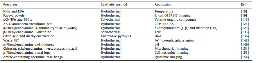 It is universal to synthesize fluorescent CDs by using organics as starting materials. Commonly used organic precursors include small organic molecules, biological macromolecules, polymers, amino acids and carbohydrate compounds, which undergo dehydration polymerization and carbonization in the process of forming CDs [38, 48-50]. Since these precursors themselves contain abundant functional groups, such as amino, carboxyl and hydroxyl groups, which endow the as-prepared CDs with interesting properties and potential applications. Among them, citric acid is the most commonly used organic precursor [50].