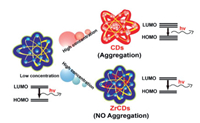 Fluorescence recovery: "On-Off" nano-hybrid systems have been constructed between fluorescent CDs and quenchers through different interactions, in which quenchers can be decomposed or complexed by analytes with the aid of various chemical reactions, and restoring the fluorescence of CDs. This type of systems has been widely reported.