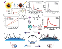Oxidation/reduction reaction-based sensing: The fluorescence of 2, 5-diaminobenzenesulfonic acid-derived RD-CDs can be quenched by hypochlorite (ClO-) by means of oxidation reaction as well as forming nonluminescent complex. Then the oxidant of RD-CDs was deoxygenized by ascorbic acid (AA), leading to the recovery of RD-CDs fluorescence (Fig. 13a) [121]. Zheng et al. prepared CDs from citric acid and diethylenetriamine via pyrolysis. The fluorescence of CDs was quenched via IFE. After adding AA, Cr(VI) was reduced to Cr(III), IFE was eliminated, and the fluorescence of CDs was restored (Fig. 13b) [138]. Xu et al. constructed a nonluminescent pCDs-MnO2 for detecting GSH [146]. After adding GSH to pCDs-MnO2 solution, pCDs were released through a series of reduction processes, and their fluorescence was restored.