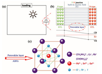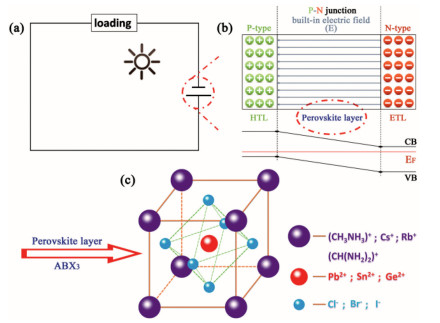 | Fig. 1. (a) Circuit diagram of the PSCs. (b) p-n junction in device. (c) lattice structure of the ABX3-type perovskite. | |
