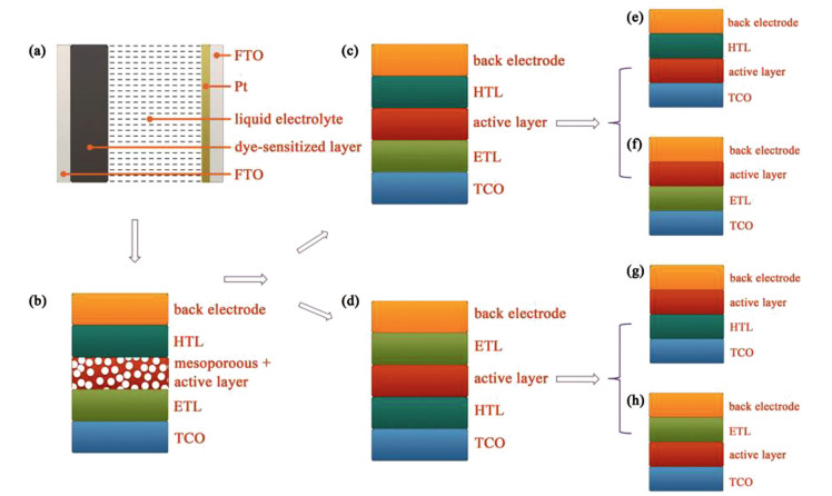 | Fig. 2. Development of the architectures: (a) liquid dye-sensitized solar cell; (b) mesoporous "n-i-p"; (c) planar "n-i-p"; (d) planar "p-i-n"; (e) planar "n-i-p"- ETL free; (f) planar "n-i-p"- HTL free; (g) planar "p-i-n"- ETL free; (h) planar "p-i-n"- HTL free. | |