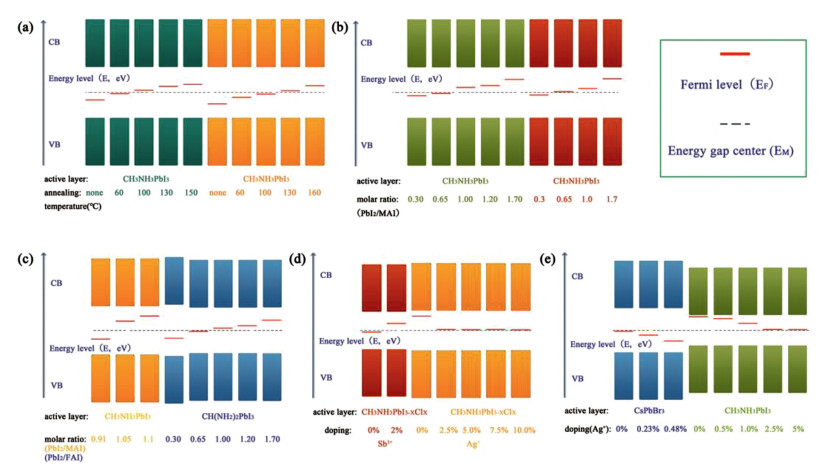 The molar ratio of the precursors, heterovalent doping, and annealing process could affect the defect type (VPb2+, VI−, Pbi2+, and VMA+) in perovskite. The majority carrier type was closely related to the defects, and could be reflected by the position of Fermi level (EF). We reproduced the schematic energy level diagram of some perovskite films including the position of EF, as shown in Fig. 5 [71-73, 88, 96-99].