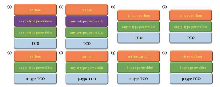 Carbon materials had an ability of extracting holes from the perovskite layer and their properties could be adjusted by controlling the doping level and the preparation process. In addition, transparent conductive oxide (TCO) played a role of transmitting sunlight and extracting carriers in PSCs. And its semiconductor type could also be changed by doping. If the N-type or p-type TCO could be used as both the CTL and electrode, the architecture of the device could be further simplified. In view of this, we proposed some innovative architectures, as shown in Fig. 6.