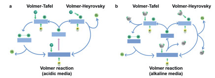 | Fig. 2. Mechanism of HER on the surface of 2D materials in (a) acidic and (b) alkaline media. | |