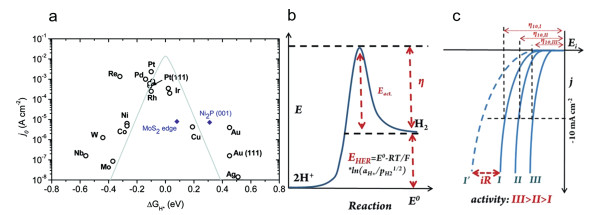 Basically, the reaction of water splitting in the electrochemical cell can start with a Nernst potential under the ideal standard temperature and pressure conditions. However, a greater potential is usually required in practical HER to overcome the energy barrier. The difference between practical potential and Nernst potential is called overpotential η (Fig. 3b). Consequently, the efficiency of water electrolysis is limited by the kinetic barrier for water dissociation. Minimizing the overpotential of HER is important for the further development of hydrogen economy.