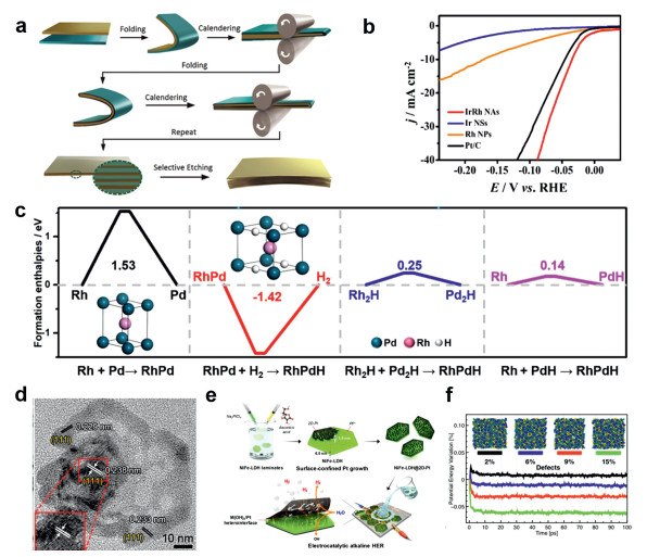 | Fig. 5. (a) Schematic showing of the fabrication of metal nanosheets. Copied with permission [65]. Copyright 2016, Wiley-VCH. (b) HER polarization curves for different catalysts. Copied with permission [70]. Copyright 2019, American Chemical Society. (c) The formation enthalpies values of RhPd and RhPd-H. Reproduced with permission [71]. Copyright 2020, American Chemical Society. (d) The HRTEM image of PtAgCo nanosheets. Reproduced with permission [72]. Copyright 2017, American Chemical Society. (e) Schematic representation for 2D-Pt on LDH synthesis and its application. Copied with permission [73]. Copyright 2020, American Chemical Society. (f) 2D suspended 10-fold material with quantities of defects in difference. Reproduced with permission [74]. Copyright 2019, American Chemical Society. | |