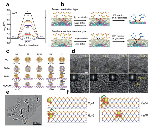| Fig. 6. (a) Calculation of △GH* values for N- and/or P-doped graphene. Reproduced with permission [18]. Copyright 2014, American Chemical Society. (b) Probable HER mechanisms for graphene-covered metal catalysts. Copied with permission [77]. Copyright 2021, Springer Nature. (c) The atomic structures of H2O, H–OH, HO, and the corresponding adsorption free energies of different catalysts. Reproduced with permission [83]. Copyright 2019, American Chemical Society. (d) In-situ HR-TEM images of CoFeO@BP during HER. Copied with permission [84]. Copyright 2020, Wiley-VCH. (e) TEM image of a typical MoS2-BP nanosheet. Reproduced with permission [85]. Copyright 2017, American Chemical Society. (f) Charge transfer which induces a bound donor-defect complex between hydrogen and armchair edge. Reproduced with permission [86]. Copyright 2019, American Chemical Society. | |