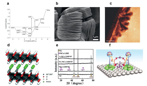 3.2.5. Layered double hydroxides (LDHs)The general formula of LDHs is [M1−x2+Mχ3+(OH)2]χ+ [Ap−χ/p]χ+·mH2O, where the M2+ and M3+ are bivalent and trivalent metallic cations, respectively (Fig. 8d). The An− represents an interlayer anion. X is the depiction of surface charge, which is subject to change for various applications [125-127]. Many highperformance 2D electrocatalysts are suitable in acidic media. In contrast, the LDHs have commendable adaptability in various alkaline media [128, 129]. The active areas of LDHs were usually buried inside or covered, leading to low inherent catalytic activity under alkaline environment. To solve this problem, Yang et al. fabricated vertically oriented array of noble metal-free Ni-Co LDH nanosheets doped by B, with low overpotentials of 151, 286 and 381 mV at large current densities of 100, 500 and 1000 mA/cm2 in 1 mol/L KOH solution, respectively. The improved electrocatalytic activity could be attributed to the deconstruction of the original crystalline structure, which is caused by the BO33− displacing the lattice OH− in LDH (Fig. 8e). This created more effective defects such as oxygen vacancies and unsaturated atoms, and finally increased the number of electrocatalytic active sites and enhanced its conductivity. Besides, the B dopants can raise the local electron density, advance the dissociation of absorbed H2O and transfer absorbed H onto the neighboring metal atoms to produce H2 [130]. Similarly, doping on a 2D single-layer Ni(OH)2 with platinum nanowires exhibited excellent electrocatalytic activity for HER in an alkaline solution with a low potential of −0.07 V at 2.48 mA/cm2. In this hybrid system, Ni(OH)2 substrates can effectively activate the HO–H bond, improving aqueous solubility of the catalyst (Fig. 8f) [26]. Besides, the unique 1D-2D ultrathin structure of the catalyst can expose more active areas, while improve the rate of electron transporting and lower dynamic barrier of Volmer step. The large contact area between Pt and LDH can effectively reduce any possible migration and aggregation, thus enhancing the catalytic stability [131].
