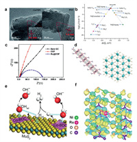| Fig. 4. (a) The TEM images of Co-COF and COF. Reproduced with permission [41]. Copyright 2019, the Royal Society of Chemistry. (b) Volcano plot of the average △GH* values of different catalysts. Copied with permission [42]. Copyright 2020, American Chemical Society (c) Impedance curves of the COF and Ru@COF. Copied with permission [43]. Copyright 2020, Wiley-VCH. (d) The structure of the MOF composing of CoO6 octahedra coordinated in a plane to ligands. Reproduced with permission [46]. Copyright 2019, Wiley-VCH. (e) The catalysis mechanism of HER in alkaline solution on the Co-MOF/MoS2 nanosheets. Copied with permission [54]. Copyright 2019, Wiley-VCH. (f) The charge density of Ni-BDC and NiRu0.13-BDC. Reproduced with permission [57]. Copyright 2021, Springer Nature. | |